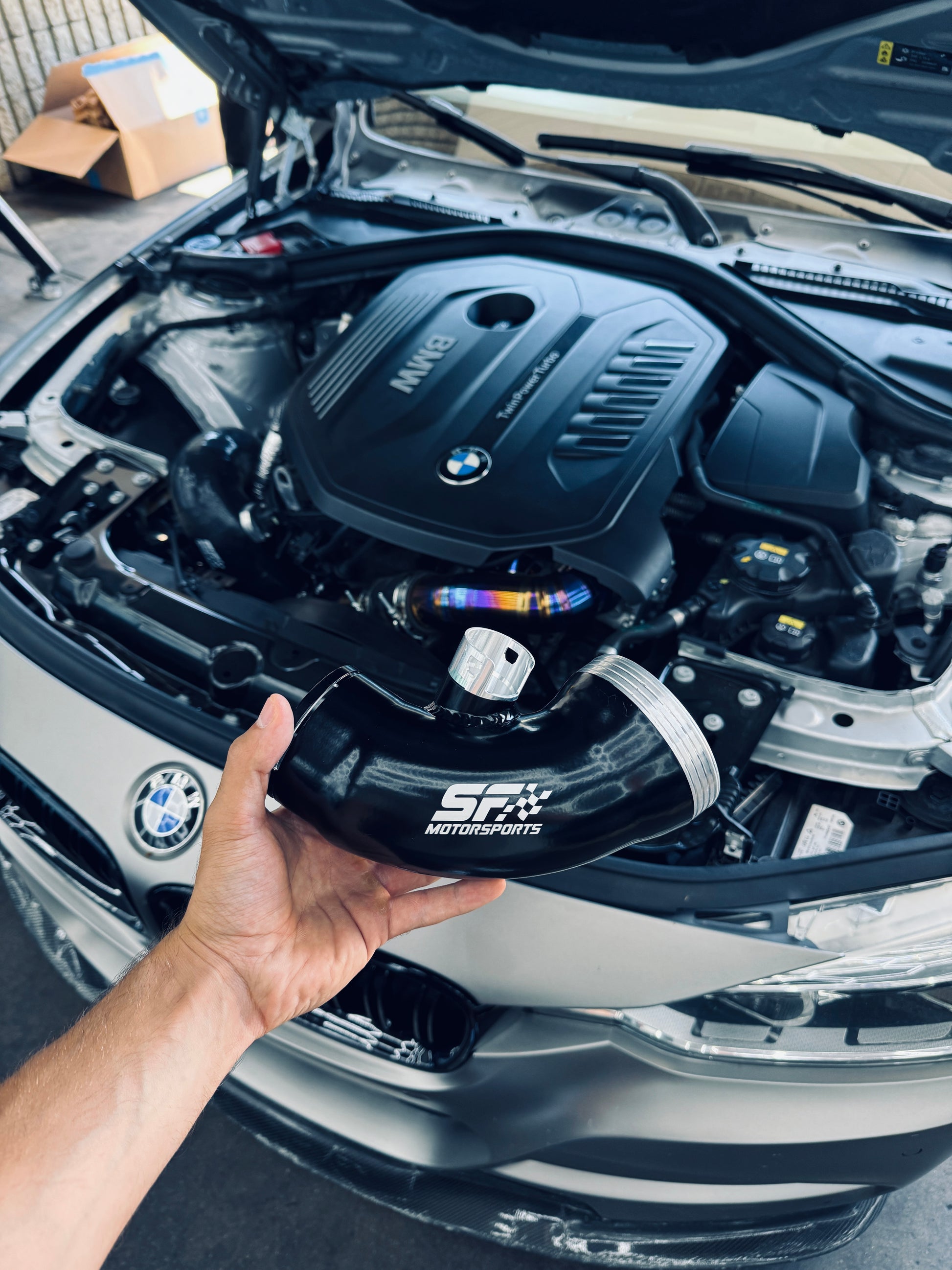 Our Gen 1 B58 Aluminum Turbo Inlet offers enhanced durability and heat resistance compared to the factory plastic one. Constructed from high-quality aluminum, it provides stronger performance under extreme engine conditions while helping to reduce heat soak. This upgrade also contributes to improved airflow and sound characteristics, delivering a more responsive and refined turbo experience.