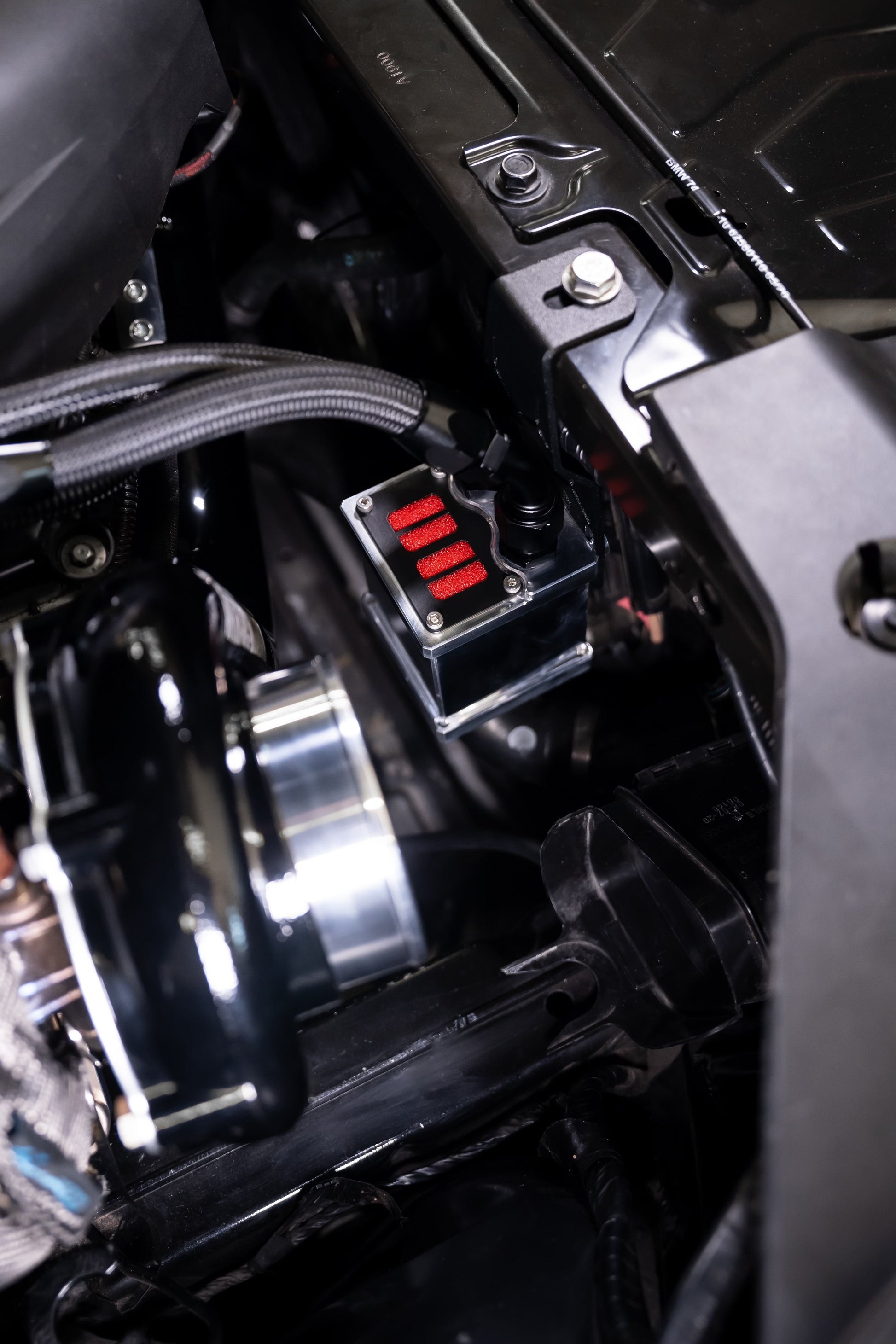 Our new options for fitment determine one of two mounting locations for the catch can. If you select stock / hybrid turbo then you will receive a mounting bracket and lines that mount the catch can on the strut tower behind the airbox.